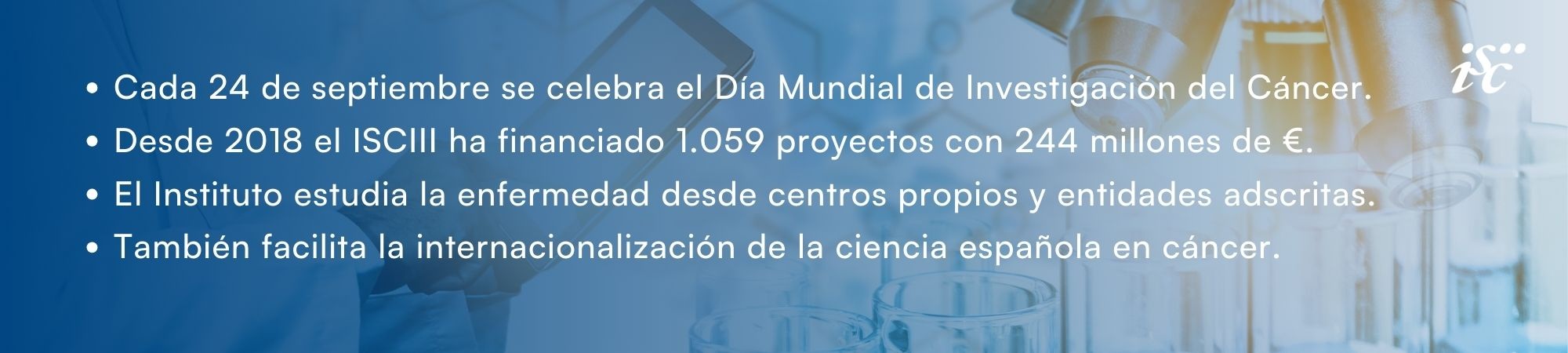 Este miércoles, como cada 24 de septiembre, se conmemora un nuevo Día Mundial de la Investigación del Cáncer. El Instituto de Salud Carlos III (ISCIII) se suma un año más a la difusión y visibilización del impulso al estudio del cáncer, una labor que el Instituto lleva a cabo principalmente desde el ámbito de la investigación y desde su faceta como agente financiador de la ciencia. A ello se suma la implicación desde el ámbito internacional.