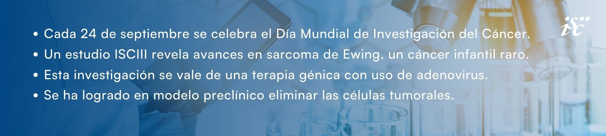 El estudio se enmarca dentro de la línea de investigación del grupo del IIER-ISCIII encaminada a desarrollar nuevas terapias disruptivas para el tratamiento del sarcoma de Ewing. En palabras del director de la investigación, Javier Alonso, en los últimos 20 años “no ha habido ningún avance significativo en los tratamientos para este cáncer infantil devastador. Es, por tanto, absolutamente imprescindible explorar nuevas vías de tratamiento que sean diferentes a los tratamientos convencionales, que sabemos ya han llegado al máximo que pueden dar. La terapia que hemos desarrollado ha demostrado ser muy específica y muy eficaz en los estudios preclínicos, por lo que creemos que esta terapia podría probarse en un primer ensayo clínico en pacientes en un plazo relativamente corto de tiempo, si disponemos de la financiación adecuada”.