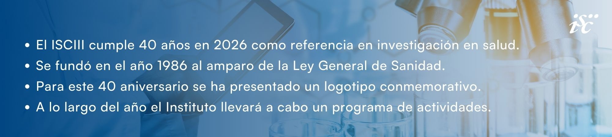 Este año 2026 en el Instituto de Salud Carlos III (ISCIII) celebramos 40 años desde nuestra creación. Con motivo de este 40 aniversario, presentamos un logotipo conmemorativo, como punto de partida de un programa de iniciativas y actividades que se desarrollarán a lo largo de todo 2026.